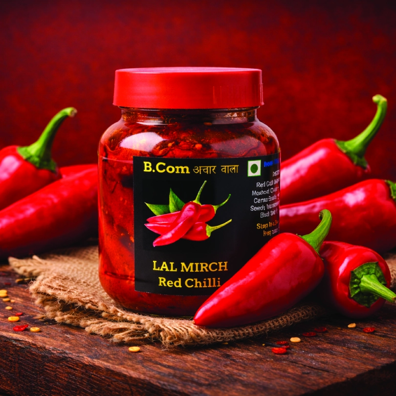 1. Our stuffed red chilli pickle is made... 1. Our stuffed red chilli pickle is made using home uses ingredients like salt, turmeric, and cold-pressed mustard oil—with no added preservatives, garlic, or onion.